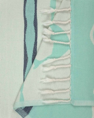 Dolphin Waves design, made from Turkish organic cotton for a softer hand feel and a better sustainable product, regular size, jacquard weave, twisted tassels, quick dry and repels sand.